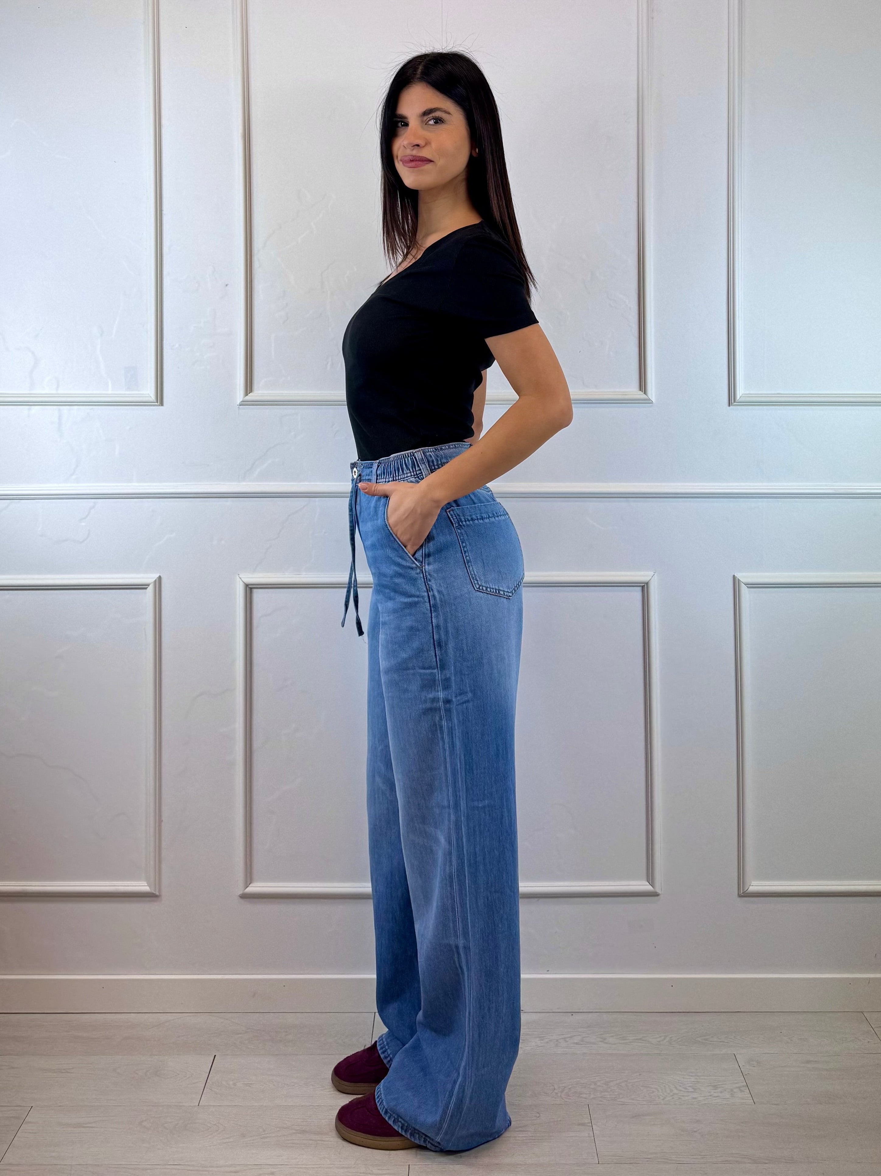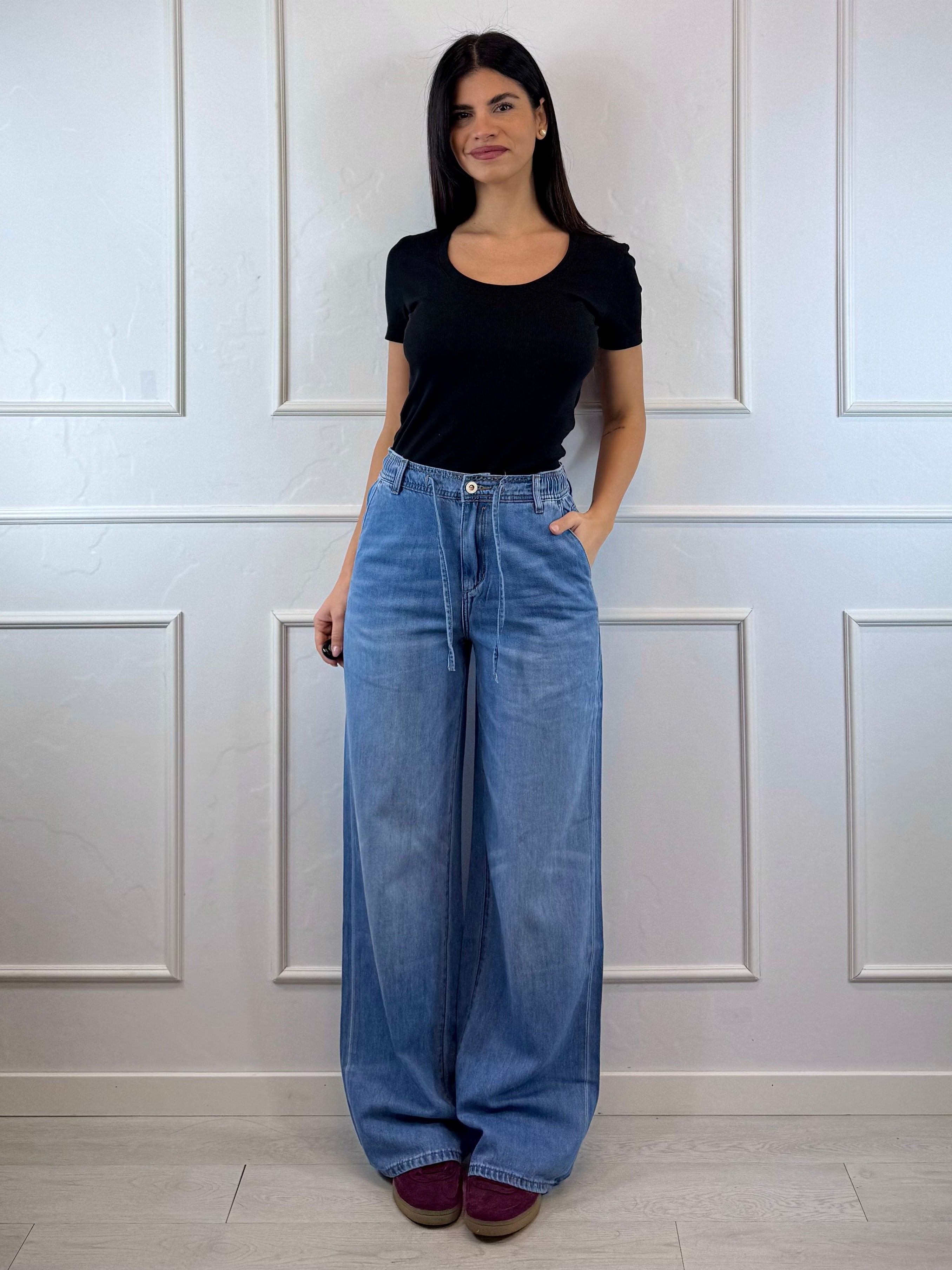 Jeans a palazzo con vita arricciata e coulisse, dallo stile moderno e femminile, pensato per slanciare la figura e garantire comfort con stile.