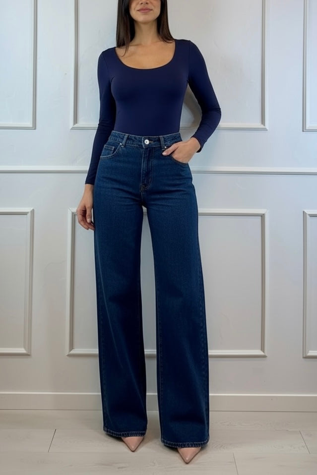 Body a manica lunga con scollo tondo, essenziale e femminile, pensato per valorizzare la silhouette con semplicità.
