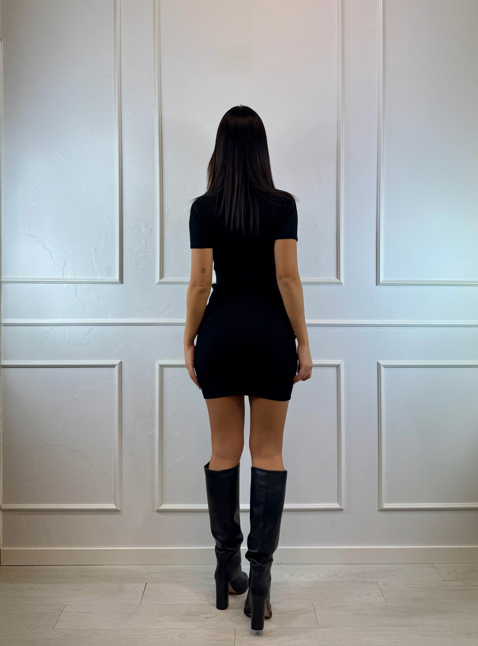 Tubino in maglia a manica corta dal design essenziale e femminile, pensato per valorizzare la silhouette con semplicità ed eleganza.
